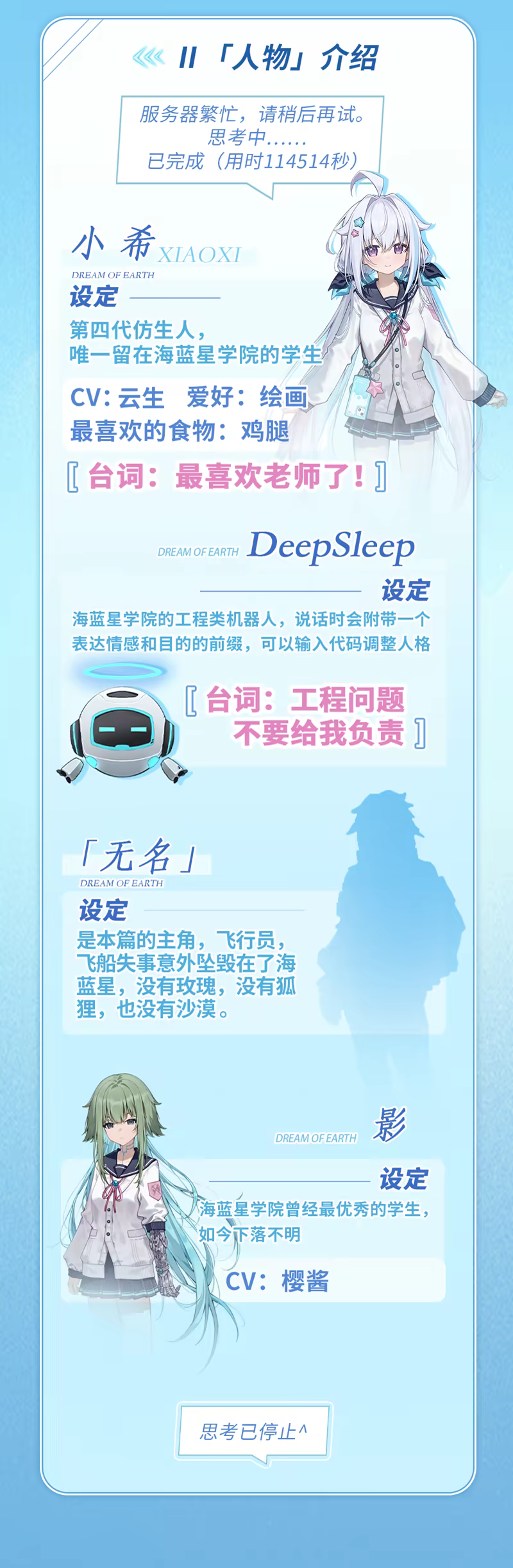 我们是国产galgame独立开发团队PygmaGame,团队成员曾参与《苍空的彼端》制作。受到《星之梦》、《星之终途》、《Atri》等一系列作品影响,再加上作者本人喜欢科幻,对科幻黄金时代的作品也涉猎广泛(而且仿生人很可爱),因此制作本游戏。