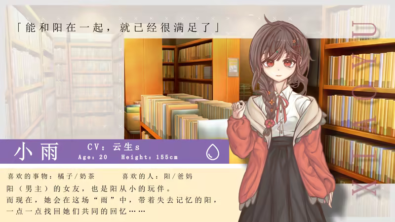 《恋与未歇之雨》作为Mirreams的第一部作品,是一部双结局的文字冒险游戏,包括序章及后日谈在内共7个章节,文本总量约7万字。